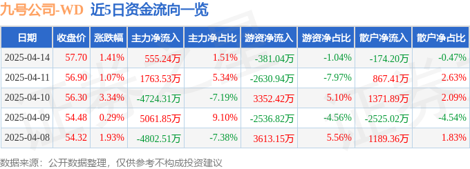 证券之星消息,截至2025年4月14日收盘,九号公司(689009)报收于57.7元,上涨1.41%,换手率1.16%,成交量6.36万手,成交额3.68亿元。