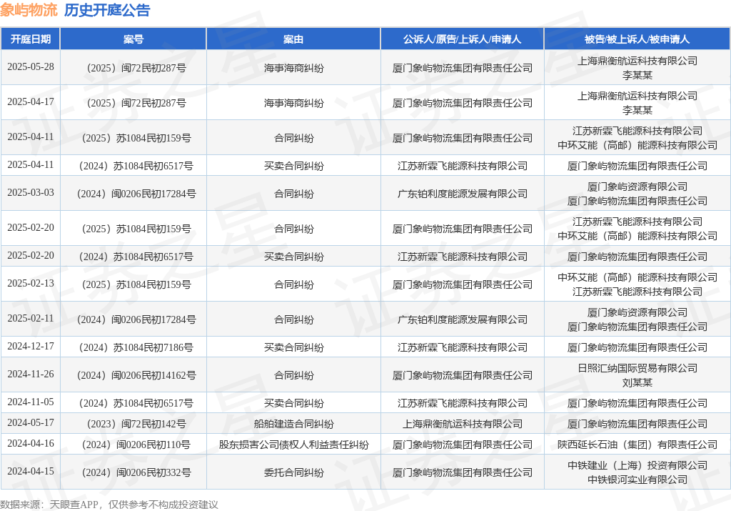 案号:(2025)闽72民初287号根据统计,近一年内以厦门象屿物流集团有限责任公司为当事人的历史开庭公告有15则,其中案由为“合同纠纷”的公告以6则居首,其次为“买卖合同纠纷”有4则,“海事海商纠纷”有2则。历史开庭公告如下:
