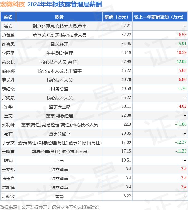 证券之星消息,宏微科技发布2024年年报,数据显示:公司主营收入13.31亿元,同比减11.52%。归母净利润为-1446.73万元,同比减112.45%。扣非净利润为-3399.02万元,同比减133.73%。当年公司员工总数1093人,同比增12.56%。人均薪酬17.73万元(注:"人均薪酬"根据定期报告中"应付职工薪酬"附注的本期增加值 / 员工总数计算而来),同比增27.83%。人均创收121.81万元,同比减21.4%。其中管理层薪酬总额为689.18万元,同比上一年增8.49%,薪酬最高的为副总经理,核心技术人员,董事崔崧,薪酬92.21万元。
