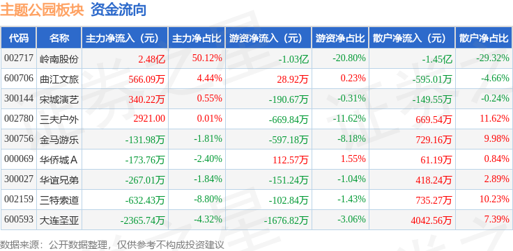 从资金流向上来看,当日主题公园板块主力资金净流入2.21亿元,游资资金净流出1.35亿元,散户资金净流出8579.97万元。主题公园板块个股资金流向见下表: