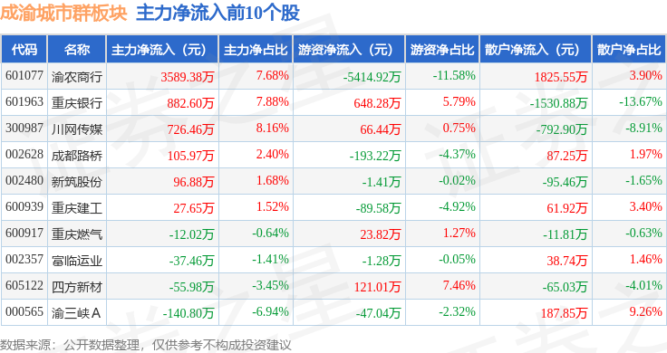 从资金流向上来看,当日成渝城市群板块主力资金净流出1.5亿元,游资资金净流出1438.84万元,散户资金净流入1.64亿元。成渝城市群板块个股资金流向见下表: