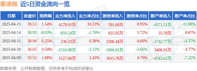 证券之星消息,截至2025年4月15日收盘,泰凌微(688591)报收于39.53元,上涨1.54%,换手率6.33%,成交量10.46万手,成交额4.13亿元。