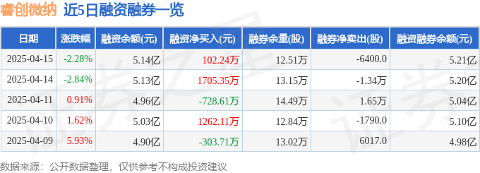 睿创微纳融资融券信息显示,融资方面,当日融资买入2715.45万元,融资偿还2613.21万元,融资净买入102.24万元。融券方面,融券卖出1900.0股,融券偿还8300.0股,融券余量12.51万股,融券余额685.94万元。融资融券余额5.21亿元。