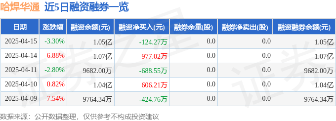 哈焊华通融资融券信息显示,融资方面,当日融资买入1939.09万元,融资偿还2063.36万元,融资净偿还124.27万元。融券方面,融券卖出0.0股,融券偿还0.0股,融券余量0.0股,融券余额0.0万元。融资融券余额1.05亿元。
