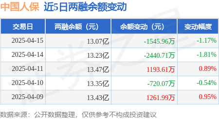 证券之星消息,4月15日,中国人保(601319)融资买入3373.77万元,融资偿还4963.42万元,融资净卖出1589.65万元,融资余额13.06亿元。