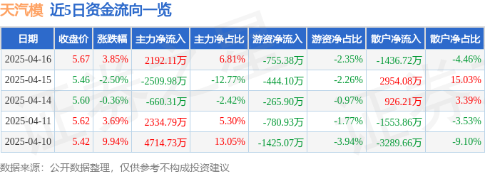 证券之星消息,截至2025年4月16日收盘,天汽模(002510)报收于5.67元,上涨3.85%,换手率5.8%,成交量58.29万手,成交额3.22亿元。