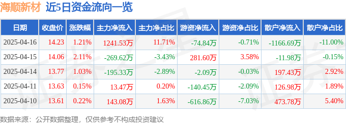 证券之星消息,截至2025年4月16日收盘,海顺新材(300501)报收于14.23元,上涨1.21%,换手率5.97%,成交量7.47万手,成交额1.06亿元。