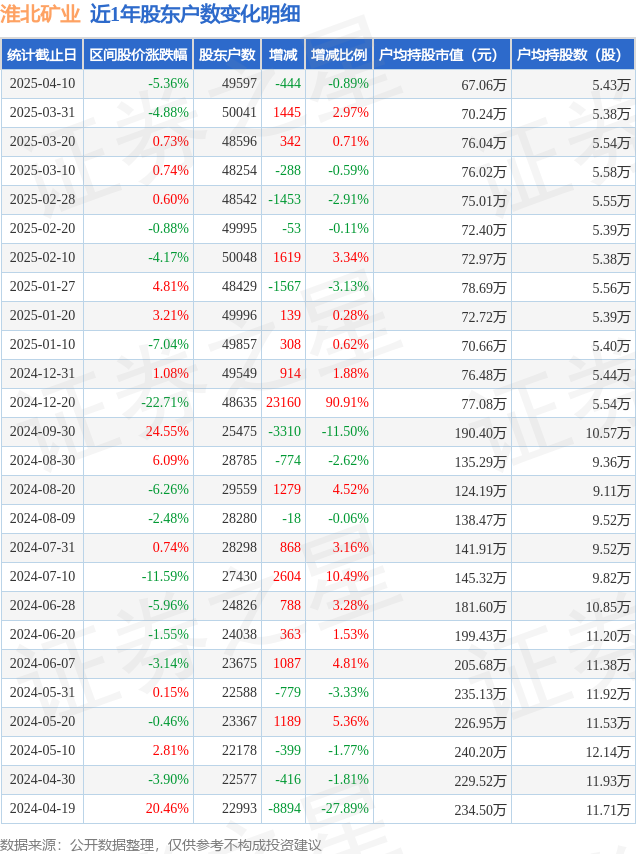 从股价来看,2025年3月31日至2025年4月10日,淮北矿业区间跌幅为5.36%,在此期间股东户数减少444.0户,减幅为0.89%。