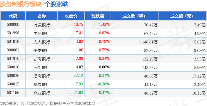 证券之星消息,4月17日股份制银行板块较上一交易日上涨0.17%,浦发银行领涨。当日上证指数报收于3280.34,上涨0.13%。深证成指报收于9759.05,下跌0.16%。股份制银行板块个股涨跌见下表: