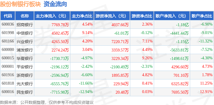 从资金流向上来看,当日股份制银行板块主力资金净流出1983.57万元,游资资金净流入1.78亿元,散户资金净流出1.58亿元。股份制银行板块个股资金流向见下表: