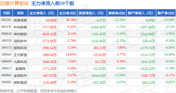 从资金流向上来看,当日边缘计算板块主力资金净流入8.83亿元,游资资金净流出6.86亿元,散户资金净流出1.97亿元。边缘计算板块个股资金流向见下表: