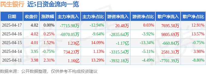 证券之星消息,截至2025年4月17日收盘,民生银行(600016)报收于4.02元,上涨0.0%,换手率0.42%,成交量148.75万手,成交额5.96亿元。