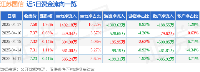 证券之星消息,截至2025年4月17日收盘,江苏国信(002608)报收于7.5元,上涨1.76%,换手率0.52%,成交量19.57万手,成交额1.46亿元。