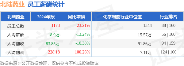 证券之星消息,4月18日北陆药业公布2024年年报,当年营收9.84亿元,同比增10.42%;净利润为1365.17万元,同比增119.02%。根据财报数据披露,当年公司员工总数1173人,同比增23.21%;人均薪酬18.9万元,同比减13.24%;人均创收83.85万元,同比减10.38%;人均创利0.02万元,同比增100.26%;公司员工薪酬统计见下表: