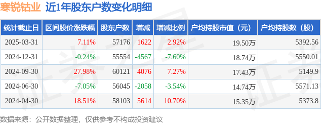 从股价来看,2024年12月31日至2025年3月31日,寒锐钴业区间涨幅为7.11%,在此期间股东户数增加1622.0户,增幅为2.92%。