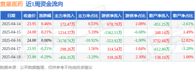 资金流向数据方面,本周复星医药主力资金合计净流出1950.02万元,游资资金合计净流出804.85万元,散户资金合计净流入2754.87万元。本周资金流向一览见下表:
