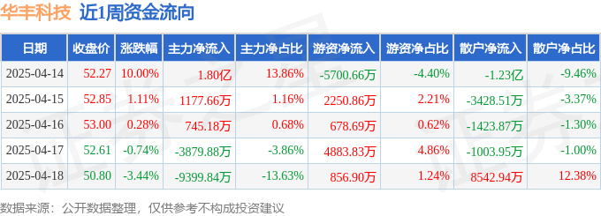 资金流向数据方面,本周华丰科技主力资金合计净流入6606.91万元,游资资金合计净流入2969.62万元,散户资金合计净流出9576.52万元。本周资金流向一览见下表: