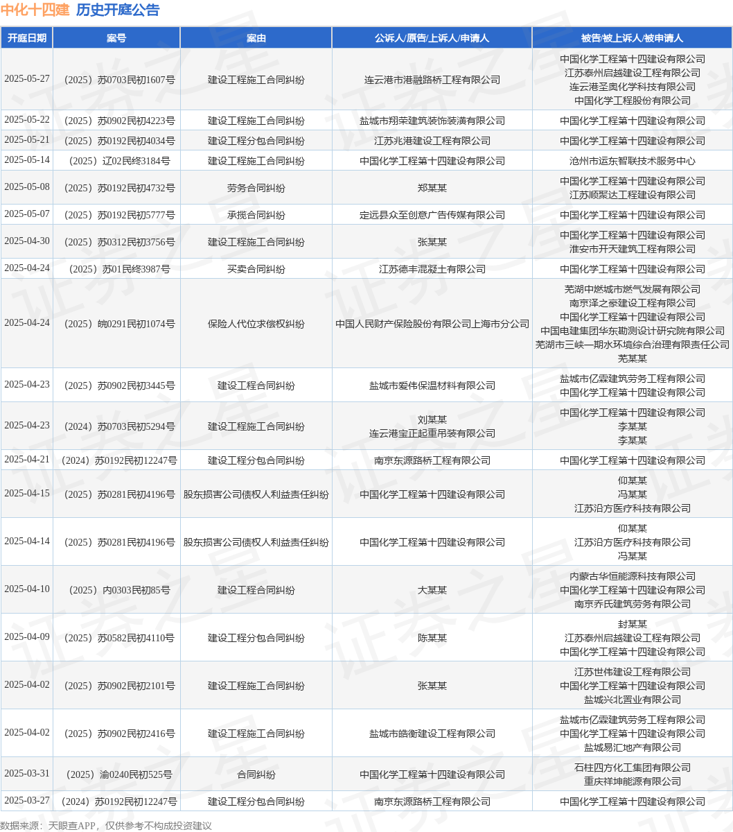 证券之星消息,根据天眼查APP显示,近日公布了一则中国化学工程第十四建设有限公司作为被告/被上诉人的开庭公告,详细内容如下: