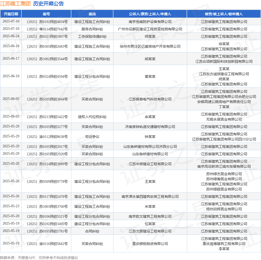 案号:(2025)苏01民终2798号根据统计,近一年内以江苏省建筑工程集团有限公司为当事人的历史开庭公告有1302则,其中案由为“买卖合同纠纷”的公告以316则居首,其次为“建设工程施工合同纠纷”有200则,“劳务合同纠纷”有123则。历史开庭公告(前20条)如下: