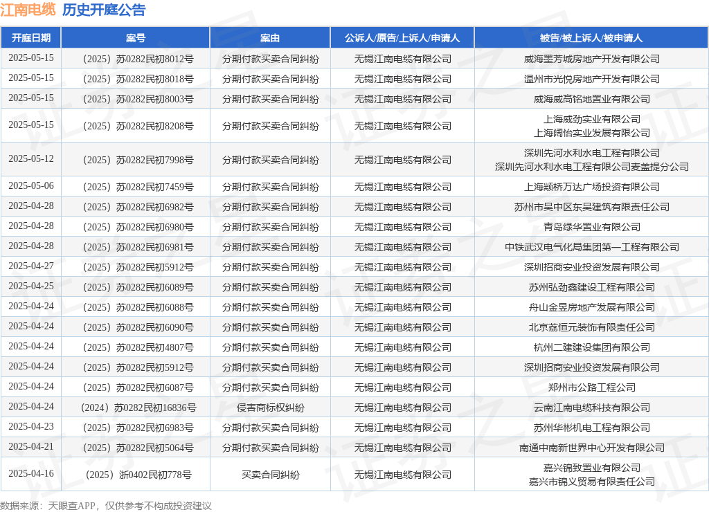 案号:(2025)苏0282民初5064号根据统计,近一年内以无锡江南电缆有限公司为当事人的历史开庭公告有124则,其中案由为“分期付款买卖合同纠纷”的公告以86则居首,其次为“买卖合同纠纷”有17则,“与公司有关的纠纷”有6则。历史开庭公告(前20条)如下: