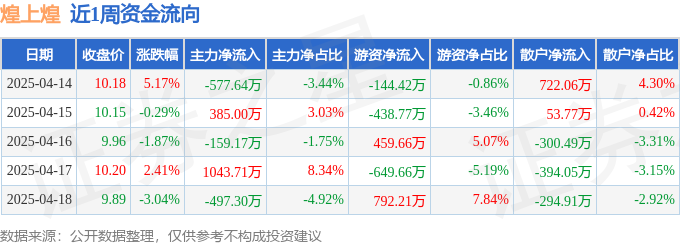 资金流向数据方面,本周煌上煌主力资金合计净流入194.6万元,游资资金合计净流入19.02万元,散户资金合计净流出213.61万元。本周资金流向一览见下表: