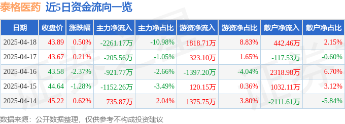 证券之星消息,截至2025年4月18日收盘,泰格医药(300347)报收于43.89元,上涨0.5%,换手率0.82%,成交量4.68万手,成交额2.06亿元。