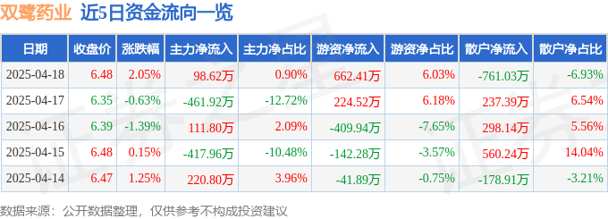 证券之星消息,截至2025年4月18日收盘,双鹭药业(002038)报收于6.48元,上涨2.05%,换手率1.97%,成交量16.8万手,成交额1.1亿元。