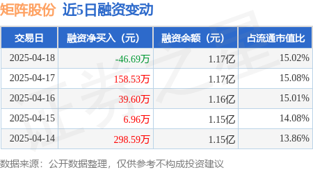 证券之星消息,4月18日,矩阵股份(301365)融资买入461.93万元,融资偿还508.63万元,融资净卖出46.69万元,融资余额1.17亿元,近20个交易日中有12个交易日出现融资净买入。