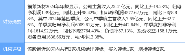 2025年4月11日,华鑫证券研究员张伟保,高铭谦发布了对福莱新材的研报《公司事件点评报告:产业一体化充实业绩,真柔性构筑成长新曲线》,该研报对福莱新材给出“买入”评级。研报中预测公司2025-2027年归母净利润分别为1.23、1.56、2.19亿元,当前股价对应PE分别为59.0、46.6、33.3倍,给予“买入”投资评级。证券之星数据中心根据近三年发布的研报数据计算,该研报作者对此股的盈利预测准确度为57.48%。
