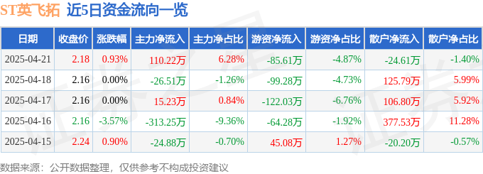 证券之星消息,截至2025年4月21日收盘,ST英飞拓(002528)报收于2.18元,上涨0.93%,换手率0.77%,成交量8.1万手,成交额1756.46万元。