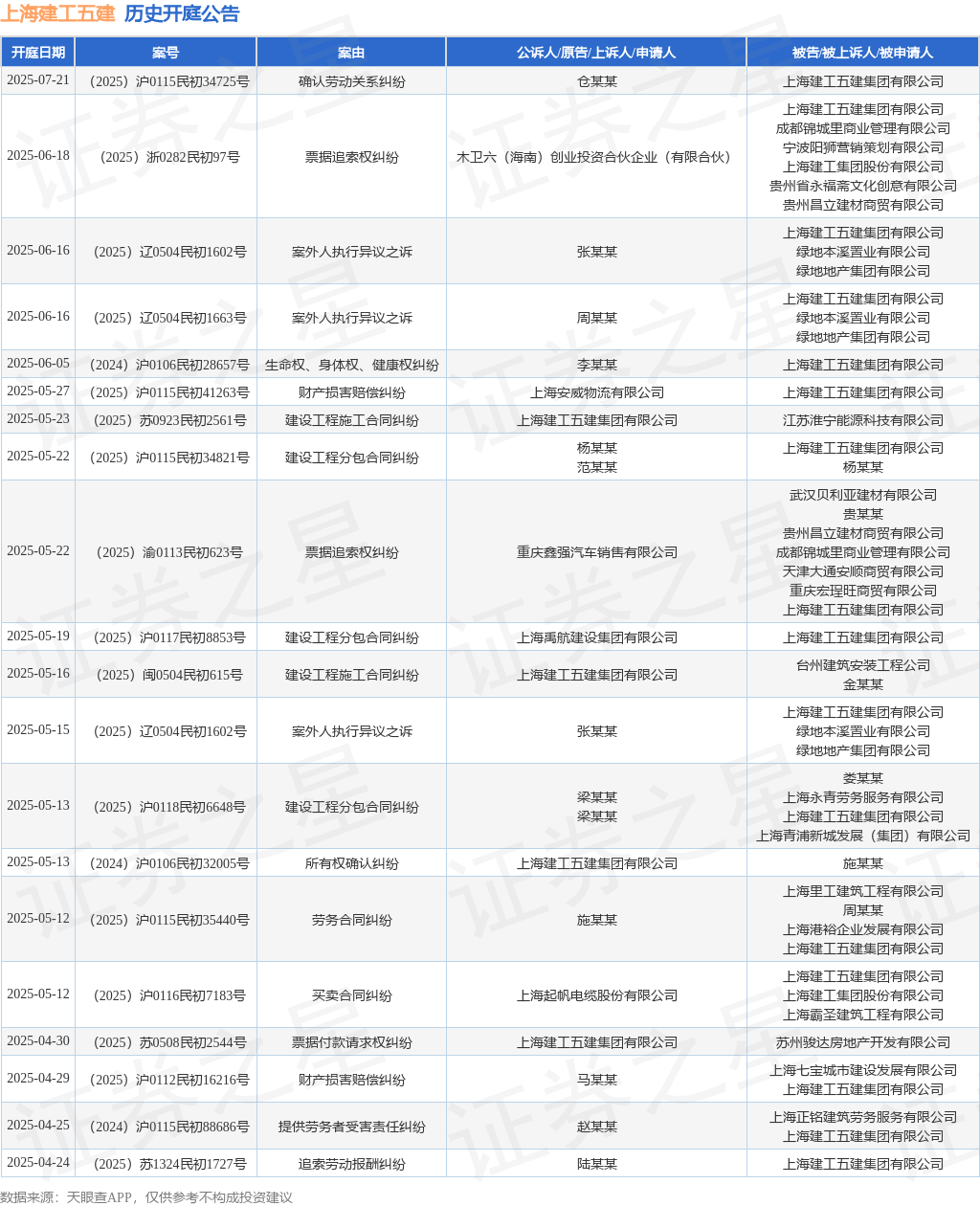 案号:(2025)沪0107民初390号根据统计,近一年内以上海建工五建集团有限公司为当事人的历史开庭公告有317则,其中案由为“建设工程施工合同纠纷”的公告以85则居首,其次为“建设工程分包合同纠纷”有58则,“劳务合同纠纷”有35则。历史开庭公告(前20条)如下: