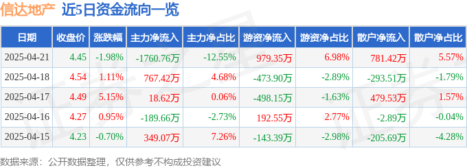 证券之星消息,截至2025年4月21日收盘,信达地产(600657)报收于4.45元,下跌1.98%,换手率1.1%,成交量31.47万手,成交额1.4亿元。