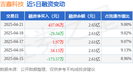 证券之星消息,4月21日,吉鑫科技(601218)融资买入816.29万元,融资偿还379.23万元,融资净买入437.06万元,融资余额2.65亿元,近20个交易日中有15个交易日出现融资净买入。