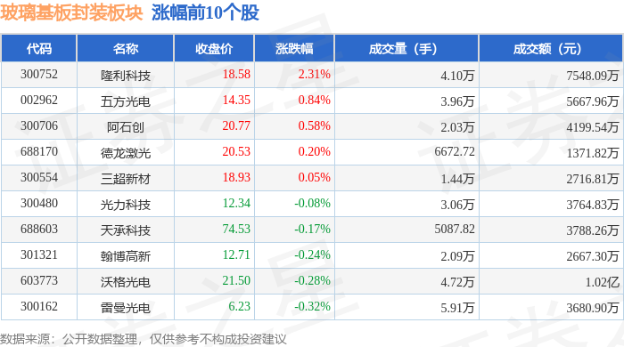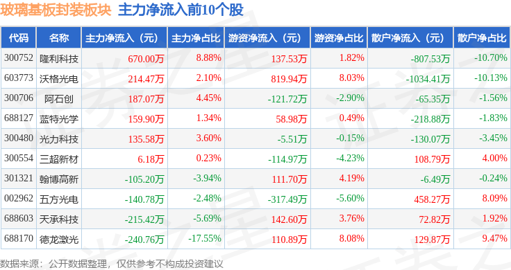 从资金流向上来看,当日玻璃基板封装板块主力资金净流出3.29亿元,游资资金净流入9456.89万元,散户资金净流入2.35亿元。玻璃基板封装板块个股资金流向见下表:
