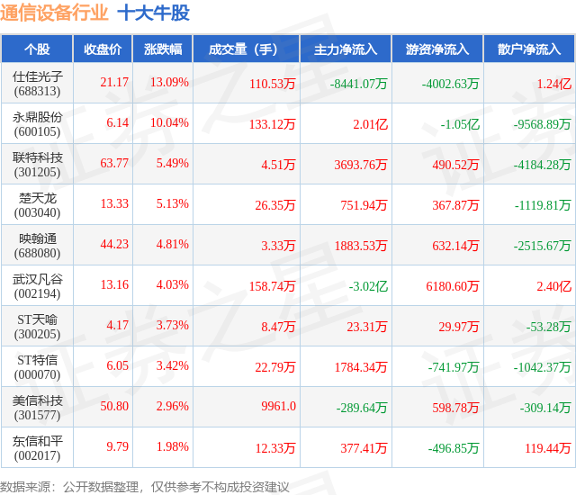 个股表现方面,通信设备行业当日领涨股为仕佳光子(688313),该股当日报收21.17,上涨13.09%,成交量110.53万,主力资金净流出8441.07万元。永鼎股份(600105)以上涨10.04%紧随其后,该股当日成交量133.12万,主力资金净流入2.01亿元。除此之外,联特科技(301205)、楚天龙(003040)、映翰通(688080)均进入当日牛股之列。具体个股列表见下表: