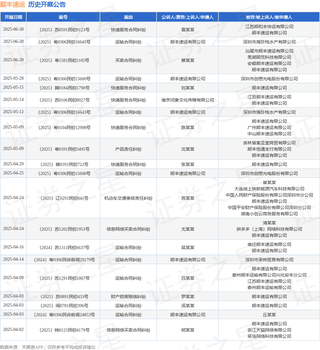 案号:(2025)粤0306民初15600号根据统计,近一年内以顺丰速运有限公司为当事人的历史开庭公告有179则,其中案由为“运输合同纠纷”的公告以63则居首,其次为“快递服务合同纠纷”有33则,“机动车交通事故责任纠纷”有17则。历史开庭公告(前20条)如下: