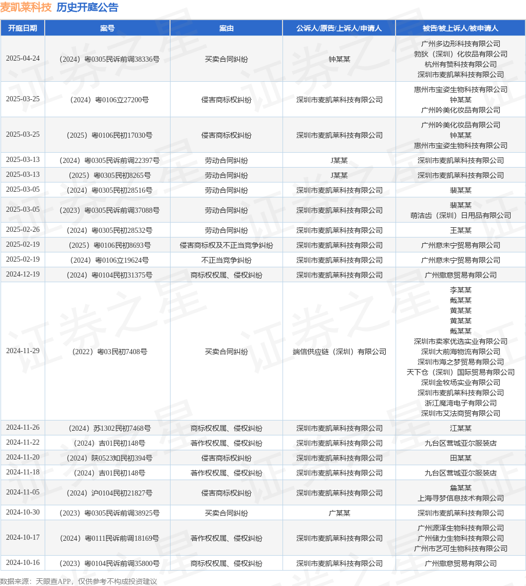 案号:(2024)粤0305民诉前调38336号根据统计,近一年内以深圳市麦凯莱科技有限公司为当事人的历史开庭公告有69则,其中案由为“侵害商标权纠纷”的公告以22则居首,其次为“买卖合同纠纷”有10则,“著作权权属、侵权纠纷”有8则。历史开庭公告(前20条)如下: