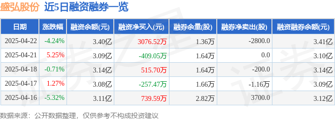 盛弘股份融资融券信息显示,融资方面,当日融资买入5414.31万元,融资偿还2337.79万元,融资净买入3076.52万元。融券方面,融券卖出500.0股,融券偿还3300.0股,融券余量1.36万股,融券余额40.22万元。融资融券余额3.41亿元。
