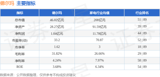 德尔玛2024年三季报显示,公司主营收入23.99亿元,同比上升5.66%;归母净利润1.04亿元,同比上升4.1%;扣非净利润9573.06万元,同比上升5.21%;其中2024年第三季度,公司单季度主营收入7.78亿元,同比上升8.8%;单季度归母净利润3601.13万元,同比上升11.18%;单季度扣非净利润3106.07万元,同比上升12.01%;负债率34.31%,投资收益1187.24万元,财务费用-1682.72万元,毛利率31.82%。德尔玛(301332)主营业务:主要从事创新家电的研发、设计、生产与销售。