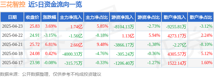 证券之星消息,截至2025年4月23日收盘,三花智控(002050)报收于25.83元,上涨3.69%,换手率3.14%,成交量115.1万手,成交额29.69亿元。