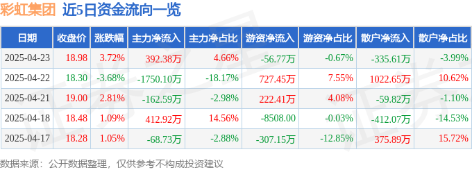 证券之星消息,截至2025年4月23日收盘,彩虹集团(003023)报收于18.98元,上涨3.72%,换手率4.26%,成交量4.47万手,成交额8421.72万元。