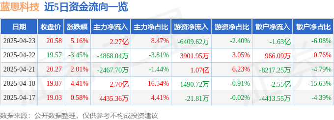 4月23日的资金流向数据方面,主力资金净流入2.27亿元,占总成交额8.47%,游资资金净流出6409.62万元,占总成交额2.4%,散户资金净流出1.63亿元,占总成交额6.08%。