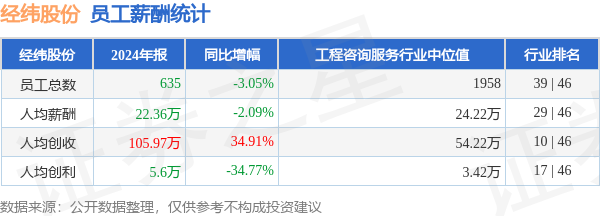 证券之星消息,4月25日经纬股份公布2024年年报,当年营收6.73亿元,同比增30.79%;净利润为3553.77万元,同比减36.76%。根据财报数据披露,当年公司员工总数635人,同比减3.05%;人均薪酬22.36万元,同比减2.09%;人均创收105.97万元,同比增34.91%;人均创利5.6万元,同比减34.77%;公司员工薪酬统计见下表: