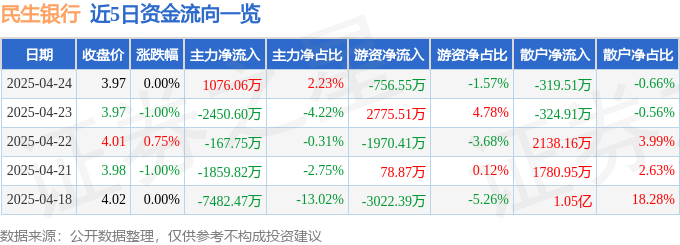 证券之星消息,截至2025年4月24日收盘,民生银行(600016)报收于3.97元,上涨0.0%,换手率0.34%,成交量121.61万手,成交额4.83亿元。