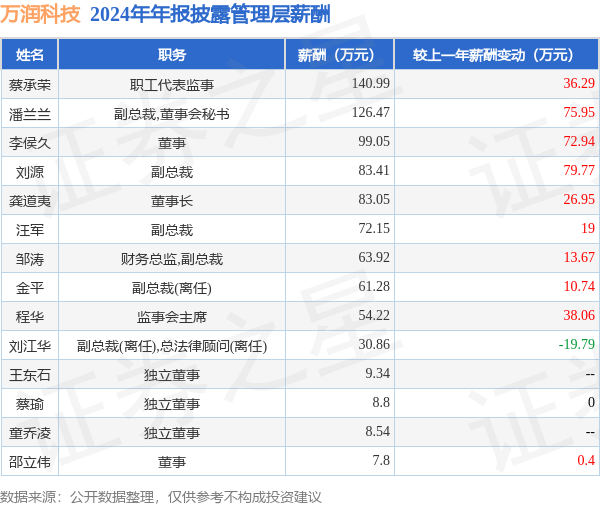 证券之星消息,万润科技发布2024年年报,数据显示:公司主营收入48.74亿元,同比增15.08%。归母净利润为6272.54万元,同比增38.62%。扣非净利润为1736.35万元,同比增114.62%。当年公司员工总数1376人,同比减6.2%。人均薪酬25.34万元(注:"人均薪酬"根据定期报告中"应付职工薪酬"附注的本期增加值 / 员工总数计算而来),同比增15.63%。人均创收354.18万元,同比增22.69%。人均创利4.39万元,同比增166.61%。其中管理层薪酬总额为849.88万元,同比上一年增13.52%,薪酬最高的为职工代表监事蔡承荣,薪酬140.99万元。