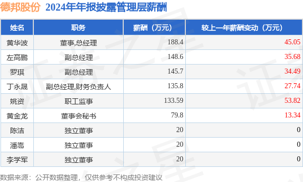 证券之星消息,德邦股份发布2024年年报,数据显示:公司主营收入403.63亿元,同比增11.26%。归母净利润为8.61亿元,同比增15.41%。扣非净利润为6.37亿元,同比增12.18%。当年公司员工总数74839人,同比减1.58%。人均薪酬11.62万元(注:"人均薪酬"根据定期报告中"应付职工薪酬"附注的本期增加值 / 员工总数计算而来),同比减1.28%。人均创收53.93万元,同比增13.05%。人均创利1.15万元,同比增17.23%。其中管理层薪酬总额为891.89万元,同比上一年减31.75%,薪酬最高的为董事,总经理黄华波,薪酬188.4万元。