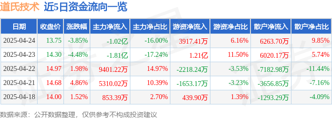 证券之星消息,截至2025年4月24日收盘,道氏技术(300409)报收于13.75元,下跌3.85%,换手率6.66%,成交量45.82万手,成交额6.36亿元。