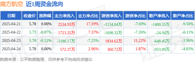 资金流向数据方面,本周南方航空主力资金合计净流入3644.04万元,游资资金合计净流出637.01万元,散户资金合计净流出3007.04万元。本周资金流向一览见下表: