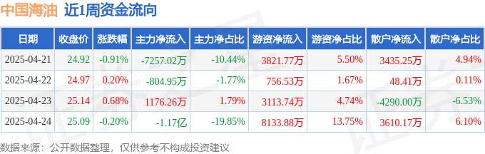 沪深股通持股方面,截止2025年4月25日收盘,中国海油沪股通持股数为5583.81万股,占流通股比为196.0%。