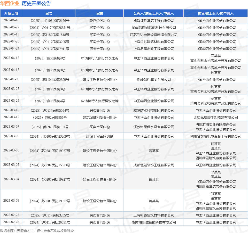 案号:(2025)沪0117民初3205号根据统计,近一年内以中国华西企业股份有限公司为当事人的历史开庭公告有358则,其中案由为“案外人执行异议之诉”的公告以85则居首,其次为“买卖合同纠纷”有63则,“建设工程分包合同纠纷”有39则。历史开庭公告(前20条)如下: